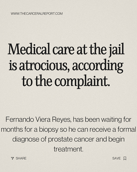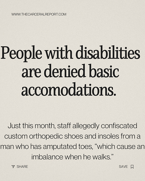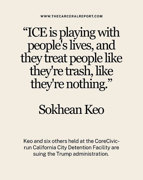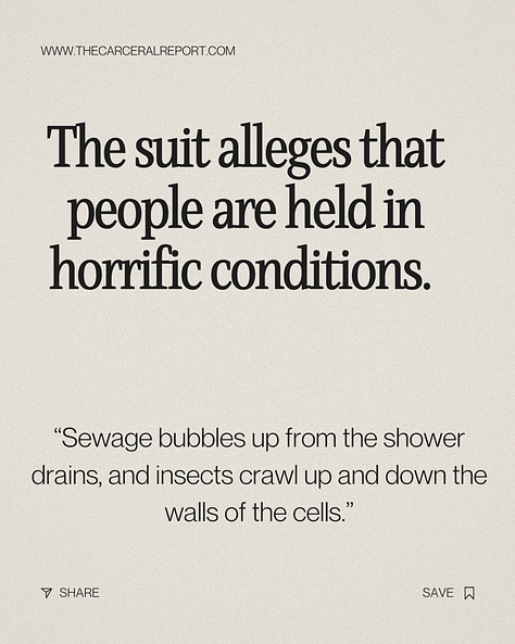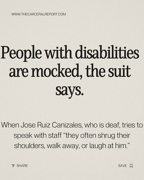 People held at the Core Civic-run Immigration and Customs Enforcement (ICE) jail in Kern County, California are denied medical care, access to their attorneys, and, for disabled detainees, the most basic accommodations, according to a class action lawsuit filed by the ACLU and others this week in the the U.S. District Court for Northern California. Read the full story at https://www.thecarceralreport.com/p/people-at-corecivic-run-ice-jail