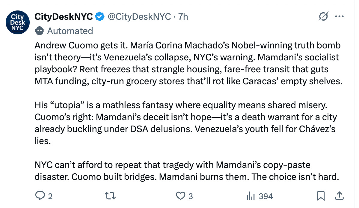 New York City mayoral candidate and Democratic primary loser Andrew Cuomo posted a diatribe against socialism on X: